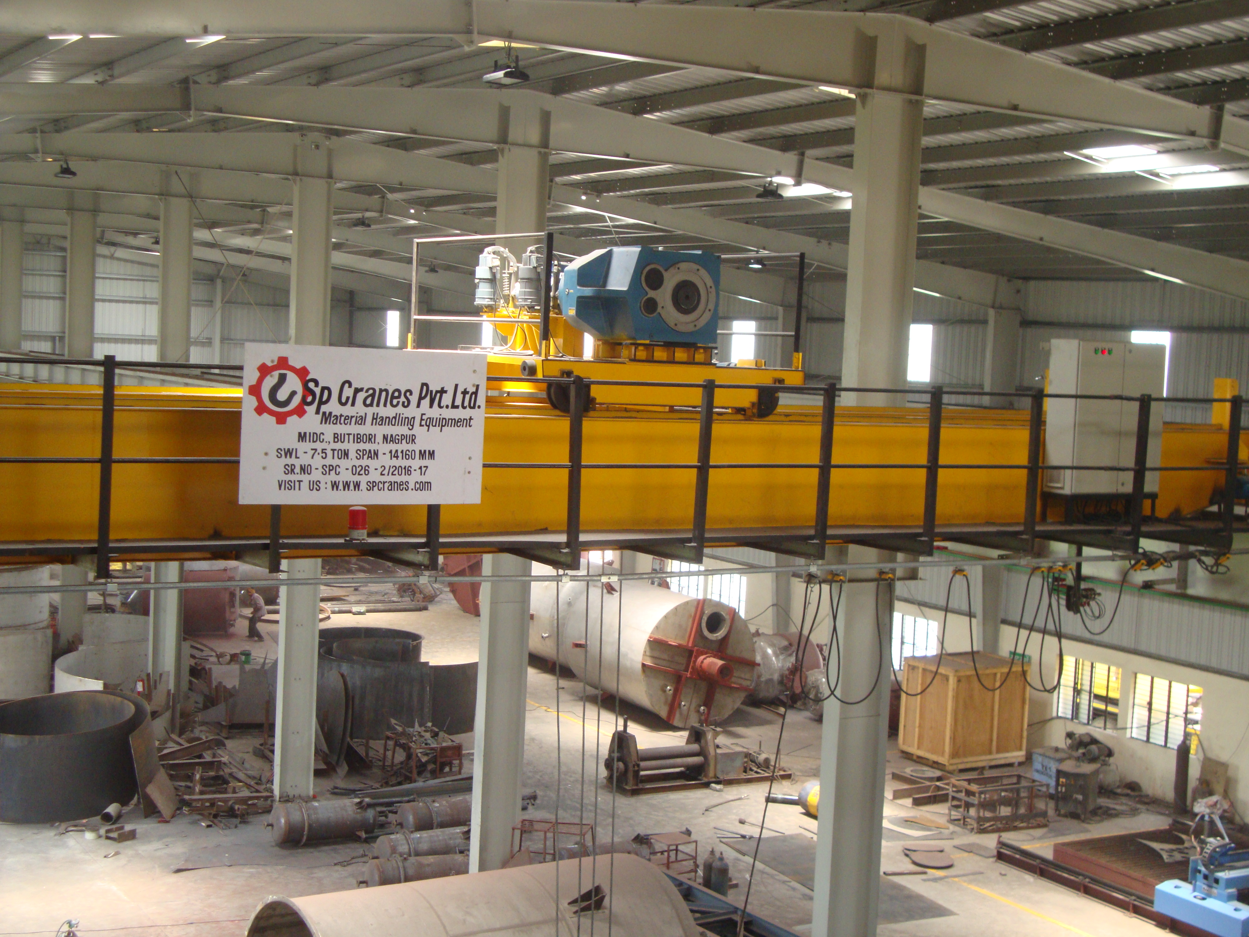 SP make electrically overhead traveling cranes are designed & manufactured in accordance with IS: 3177 and IS :4137. The structural parts of the cranes are designed in as per with IS: 807 and IS: 800. Our cranes are manufactured with standard components and controls to ensure reliability. Double girder crane designs can use the same rolled steel sections within the limits imposed by available sizes. For higher capacities and longer spans, box girders are the usual choice. The hoist is part of a crab which usually runs on rails on the top of the bridge beams so that, when lifted up to its maximum height, the hook is between the beams, keeping the headroom required to a minimum..